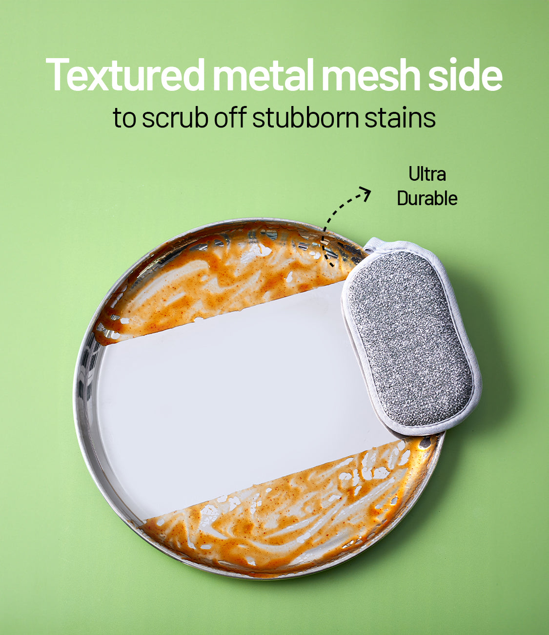 Textured metal mesh side: Perfect for tackling stubborn, hard-to-clean areas like stoves and utensils.