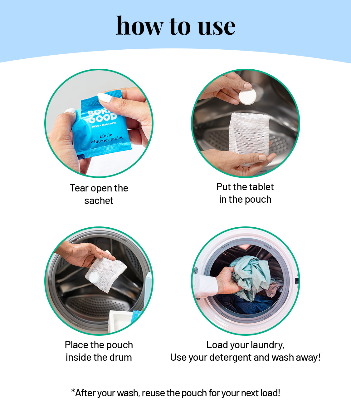 Make sure that you use our whitener tablets along with the detergent for optimum results.