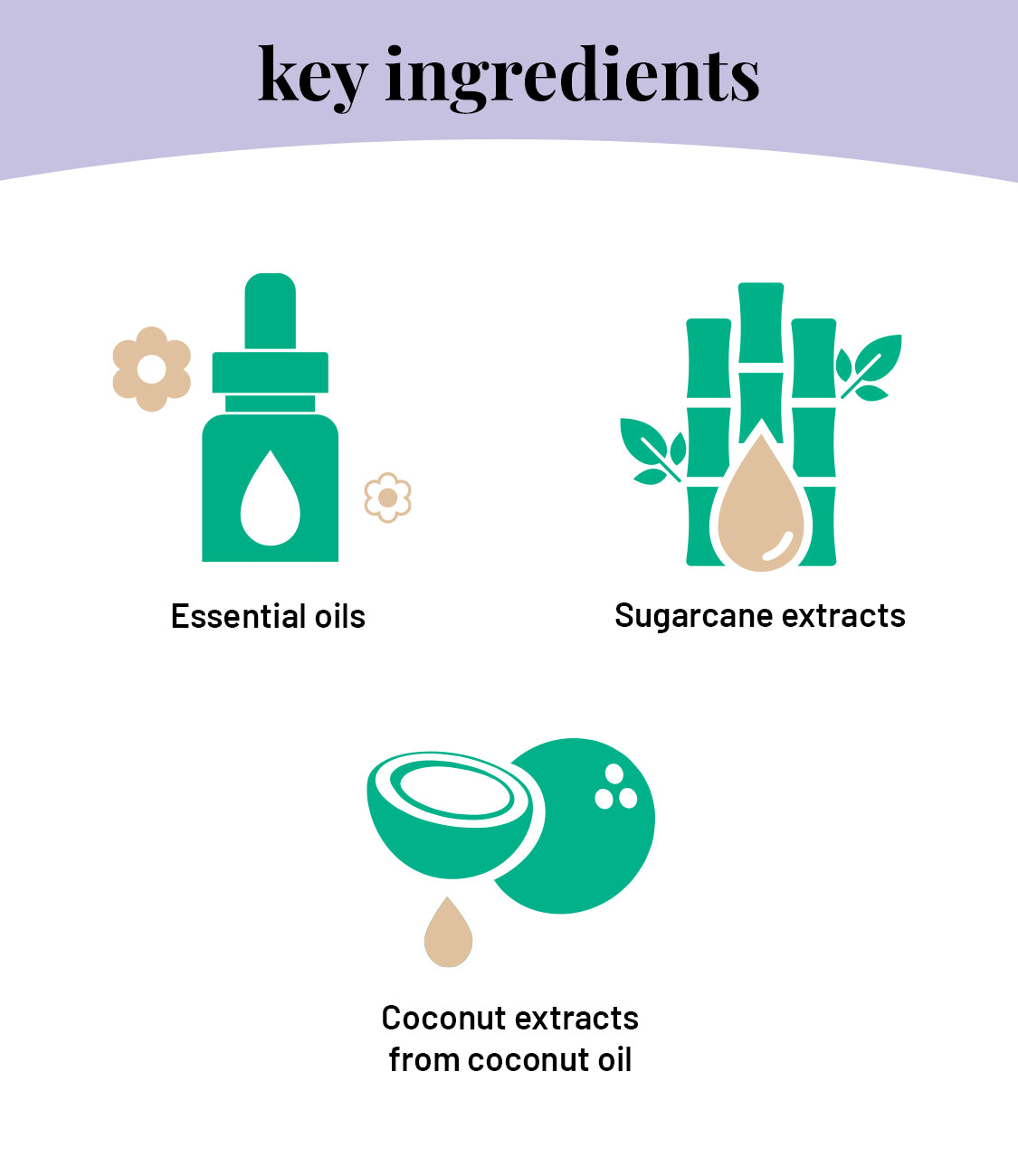 Fragrance from essential oils, lubricant from coconut extract, glycerine from sugarcane extract.